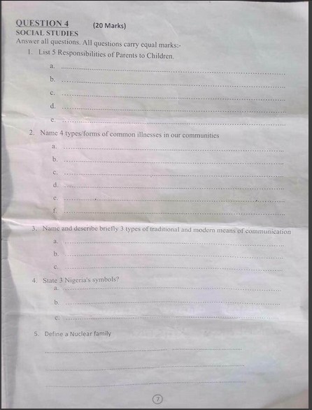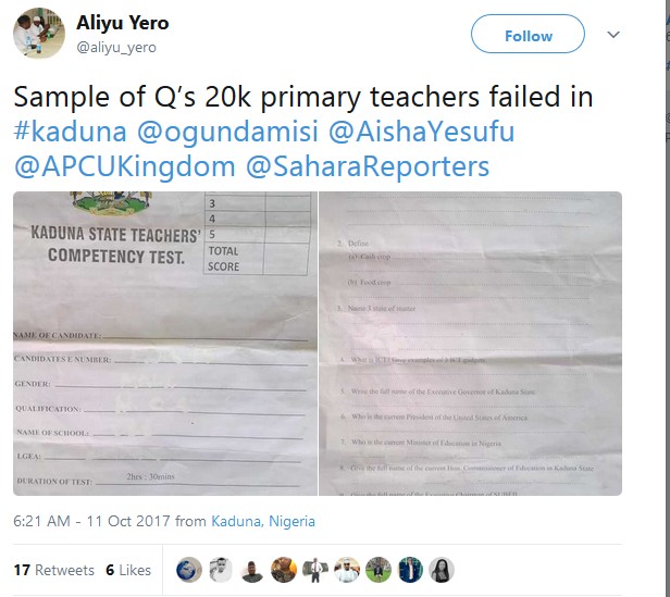 Here are copies of the primary four exam questions which many teachers failed in Kaduna state. Thousands of primary school teachers in Kaduna state are to be sacked after failing the exams they set for their six-year-old pupils.thousands of Kaduna teachers fail primary four exam