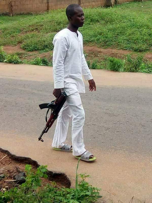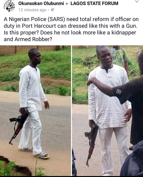 According to Olubunmi,a police officer on duty was spotted dressed in casual while on duty.He wrote..’A Nigerian Police (SARS) need total reform if officer on duty in Port Harcourt can dressed like this with a Gun. Is this proper? Does he not look more like a kidnapper and Armed Robber?’.