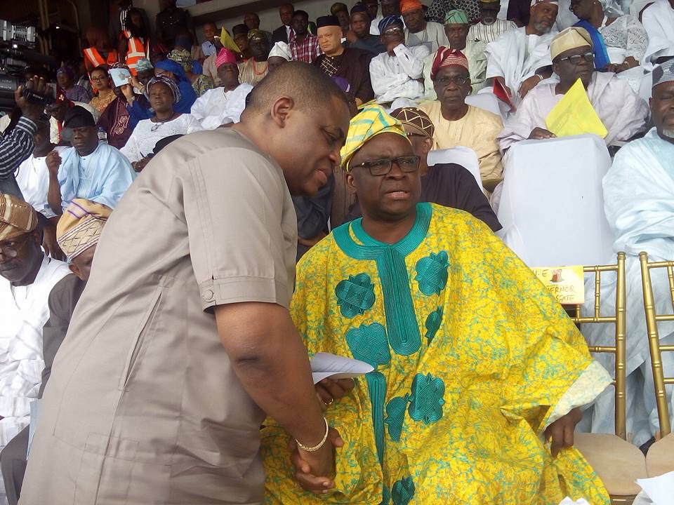 Ekiti state Governor Ayo Fayose, FFK and former Ondo state Governor Segun Mimiko at Yoruba Summit: tagged Nigeria In Search Of A Nation, holding at the Lekan Salami Stadium Adamasingba, Ibadan. See photos below
