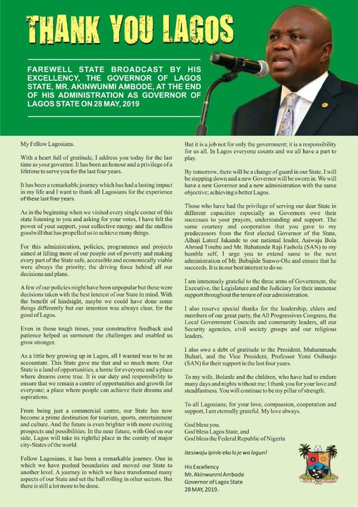 In preparation for his handing over of power tomorrow, Governor Akinwunmi Ambode sends his goodbye message to the good people of Lagos State.