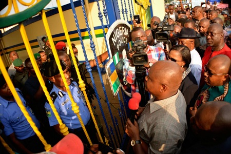 The Governor was forced to wait for 30 minutes before the Deputy Commissioner of Police, Mr. Cyril Okoro came out and spoke through the gate.