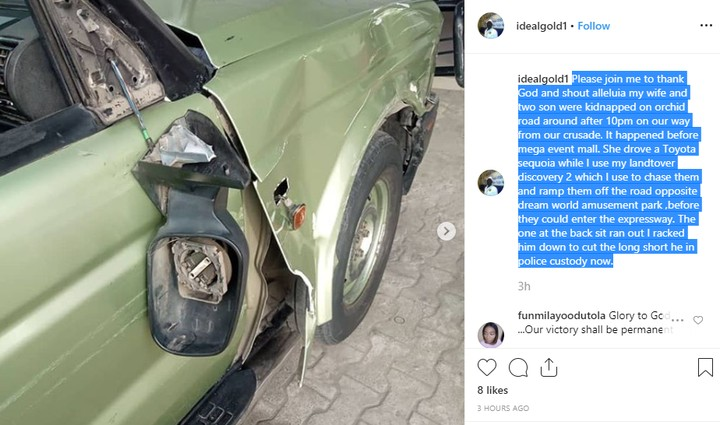 A Nigerian man took to Instagram to narrate how he saved his wife and two sons from Kidnappers, in Lekki area of Lagos State.According to the Nigerian man, he saved his wife and sons from the kidnappers who abducted them by chasing them with another car. He succeeded in cutting them off which eventually led to the arrest of one of the kidnappers.