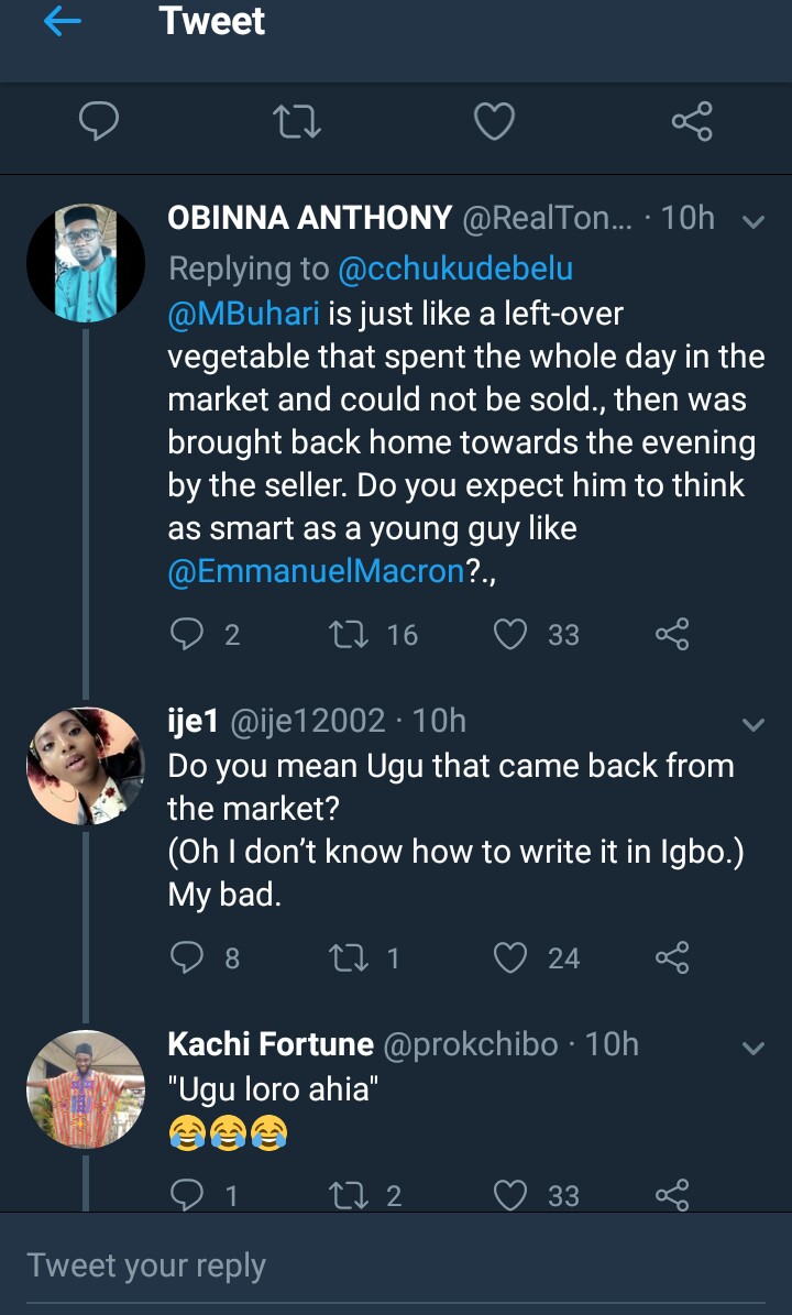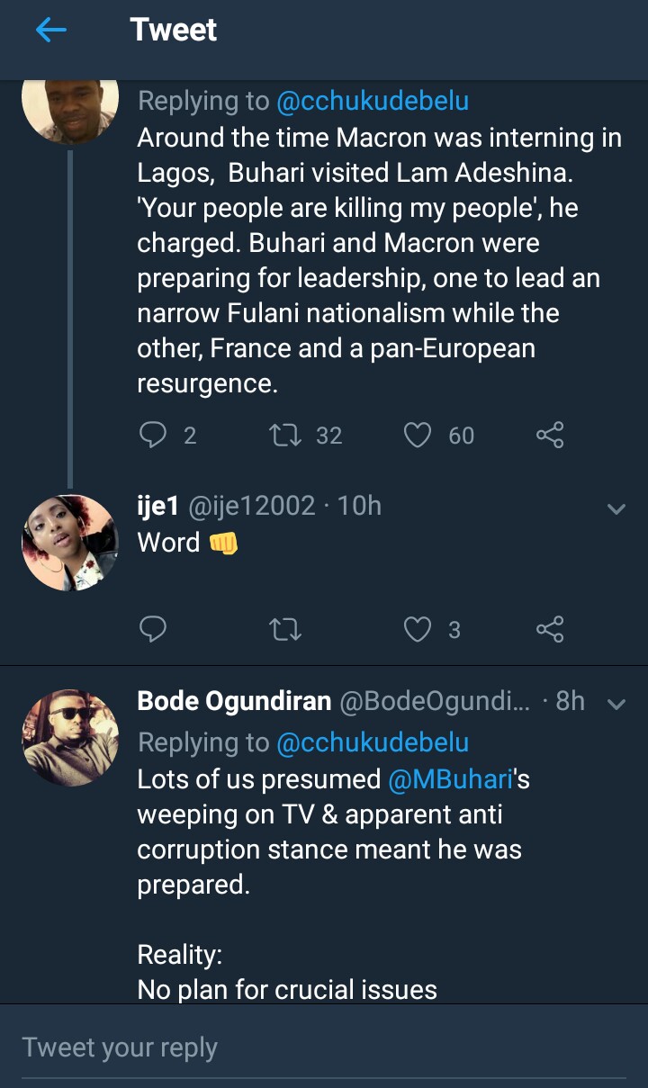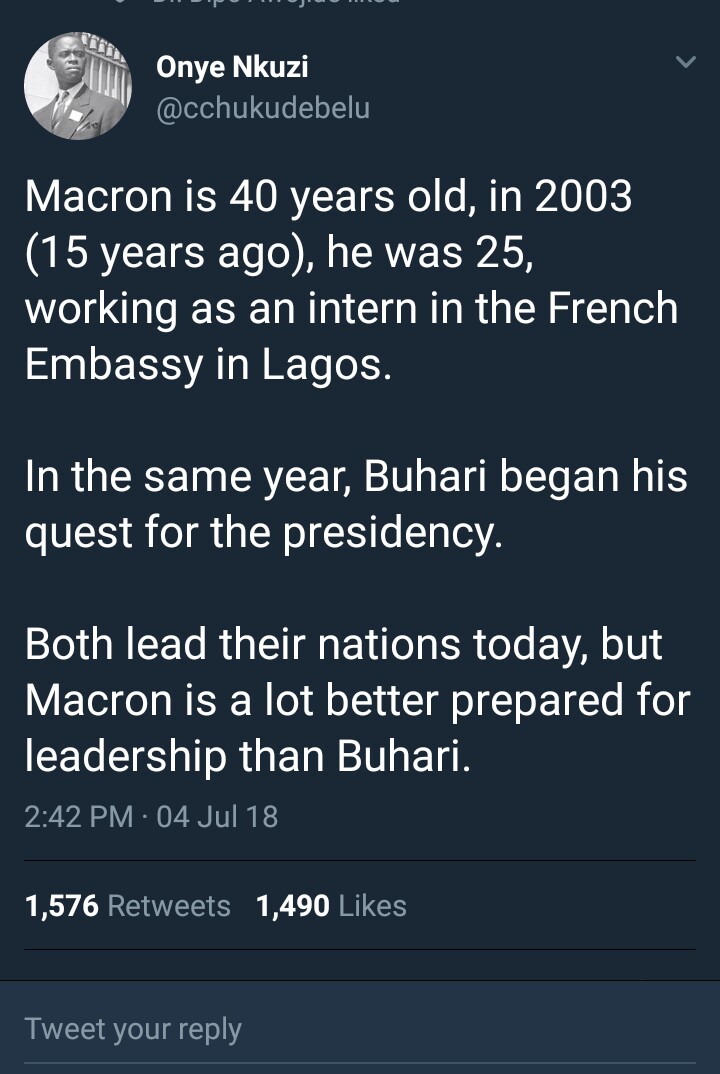 The last has not been heard of the Emmanuel Macron- the French President’s visit to Nigeria. According to this twitter user @ cchukudebelu,” the French President was in Nigeria in 2003 (15years ago), the same year Buhari began his quest for presidency”. He was of the opinion that Emmanuel Macron was a better prepared president than Buhari even though both now lead their Nations and people reacted.