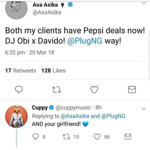 He congratulate his client who just got signed as Pepsi ambassador and DJ Cuppy replied to his post on twitter claiming his girlfriend.