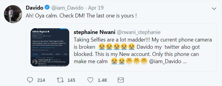 See How Lady Begged Davido For Infinix Phone On Twitter, She Got It