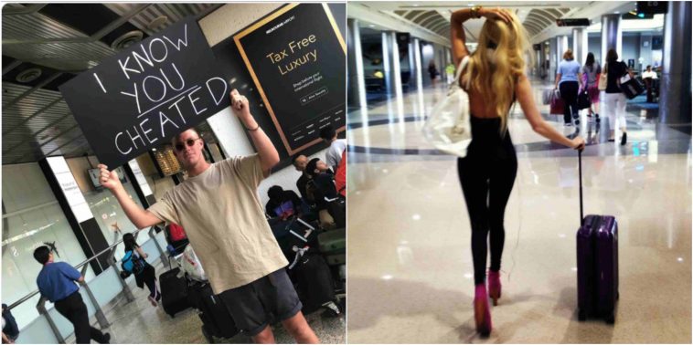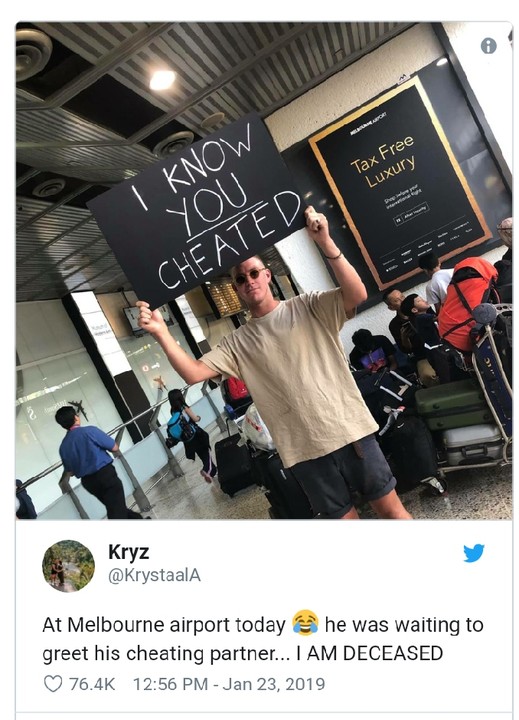 The photo of the man, standing in the airport in Melbourne, Australia with a huge sign saying “I KNOW YOU CHEATED” was posted on Twitter last Wednesday by twitter user Krystal.