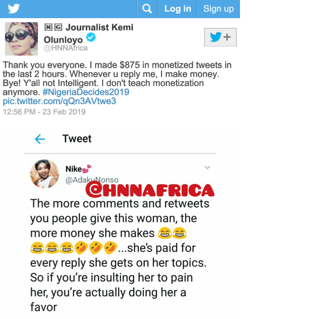 Anytime you reply her on twitter or mention her in your tweet, twitter actually pays her