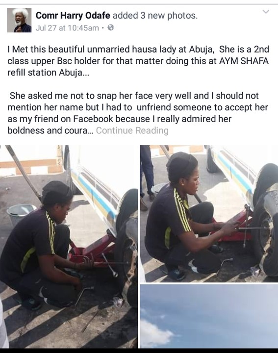 ‘I Met this beautiful unmarried hausa lady at Abuja, She is a 2nd class upper Bsc holder for that matter doing this at AYM SHAFA refill station Abuja.