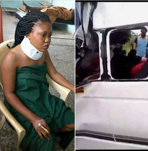 According to reports, this is one of the two victims who survived the fatal accident that claimed 8 lives at the Benin- Lagos express road two days ago. The accident killed eight indigenes of Edo state (five males and three females) who arrived from Spain for a traditional marriage after a Hummer bus conveying them rammed into a Mack truck.
