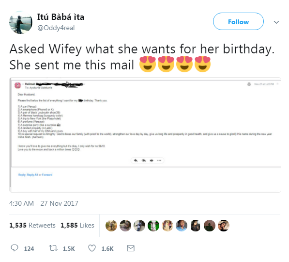 A Nigerian lawyer took to twitter to share this heartwarming email his wife sent him after he asked her what she wanted for her birthday.