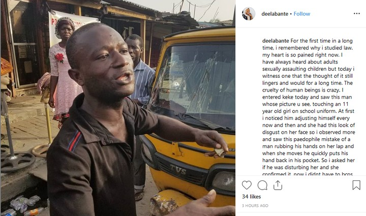 A Nigerian lawyer Ali Fadeela has taken to her Instagram page to expose a man she allegedly caught molesting 11-year-old girl inside Keke Napep.
