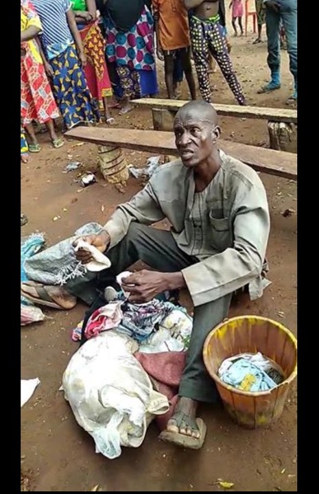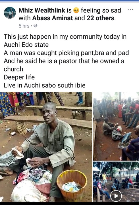 A man was caught today picking pants,bras and pads in Auchi Sabo South Ibie,Edo State. When interrogated by Mob, he said he is a pastor that he owns a Deeper Life Church