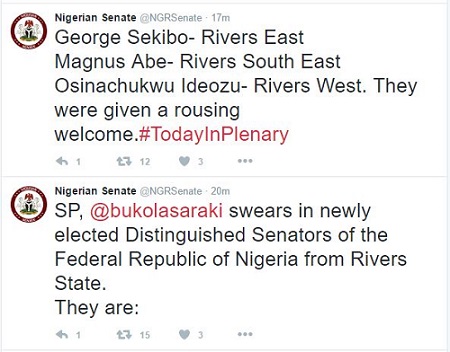 Senate President Bukola Saraki has sworn in three new senators from Rivers state after the conclusion of the rerun election that took place on Saturday.