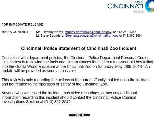 Pictured above is the three-year-old boy named Isiah Dickerson, who fell into a gorilla enclosure at the Cincinnati Zoo, Ohio, prompting zookeepers to kill the 17-year-old 450lb silverback gorilla which grabbed him. The Cincinnati Police have also released a statement, saying they are closely reviewing the facts of the case – based on the actions of his parents that led up to the incident and not related to the operation or safety of the Zoo. See the full statement after the cut.
