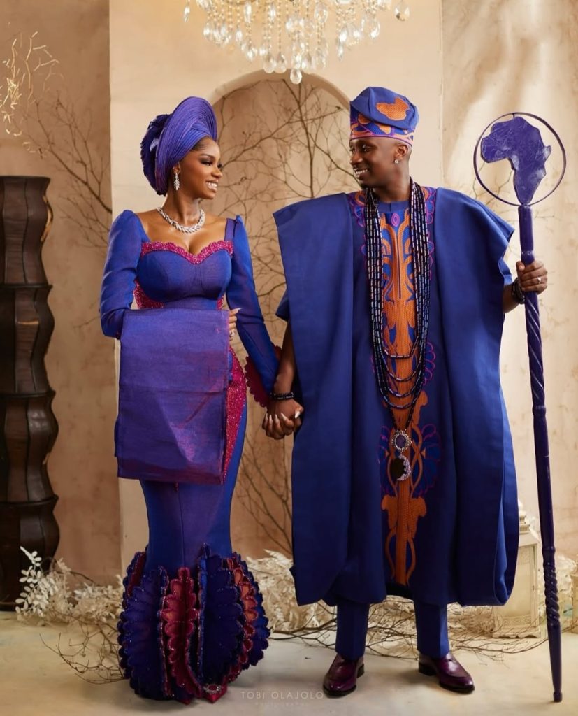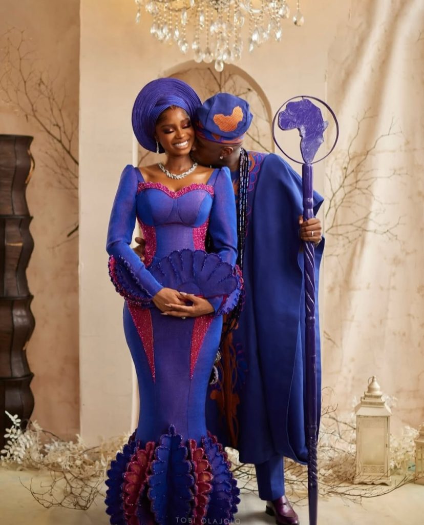 The pair stepped out in matching purple, orange and pink outfits for their Nigerian traditional wedding.