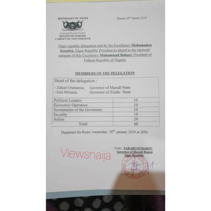 A memo has surfaced online proving that the president of Niger Republic Sent a team of 60 delegates to attend the APC presidential campaign in Kano state.