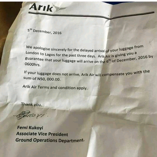 An angry passenger shared this apology letter he received from Arik Airlines, offering to pay him N50k if he doesn’t get his luggage.