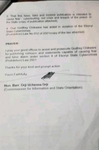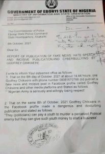 The petition dated October 8 and signed by Ebonyi State Commissioner for Information, Orji Uchenna Orji to the State Police commissioner, says that Chikwere made a “dangerous and disturbing publication intended to cause fear and breach of peace in the state”