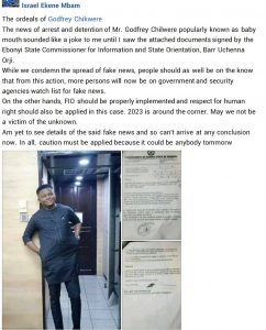 “The ordeals of Godfrey Chikwere The news of arrest and detention of Mr. Godfrey Chilwere popularly known as baby mouth sounded like a joke to me until I saw the attached documents signed by the Ebonyi State Commissioner for Information and State Orientation, Barr Uchenna Orji,” a Facebook user, Israel Ekene Mbam, wrote.