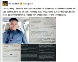 “Godfrey Chikwere is a law-abiding citizen and should not be held captive for expressing his fundamental human right which is freedom of speech except we don’t have such law again in Ebonyi state. It is only a military government that will not accept criticism, but in a democratic setting, criticism is one of the instruments of good governance. A reasonable government take correction from criticism and not otherwise. #FreeGodfreyChikwere”