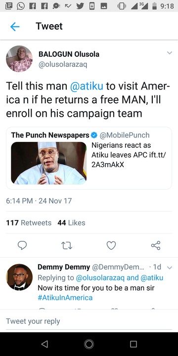 At exactly 6:14 Pm on November 24 2017 Balogun Olusola in response to a Punch Newspaper story on Atiku leaving APC tweeted: