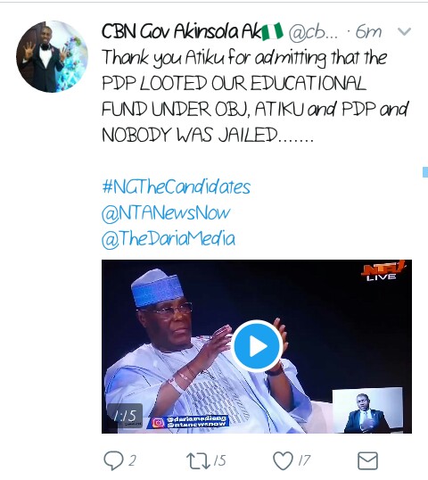 Thank you Atiku for admitting that the PDP LOOTED OUR EDUCATIONAL FUND UNDER OBJ, ATIKU and PDP and NOBODY WAS JAILED…….