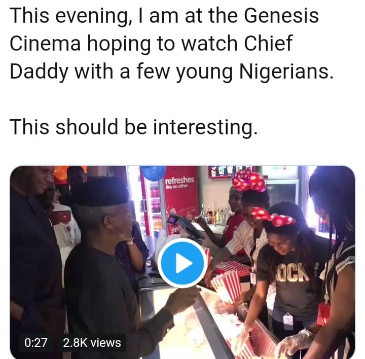 The VP Osinbajo shared this video of him in cinema and wrote: