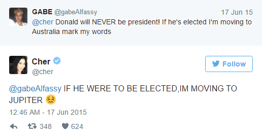 The superstar singer has been Cher-ing all her feelings via Twitter this election season. She wins the award for the furthest declared destination if the real estate magnate prevails.
