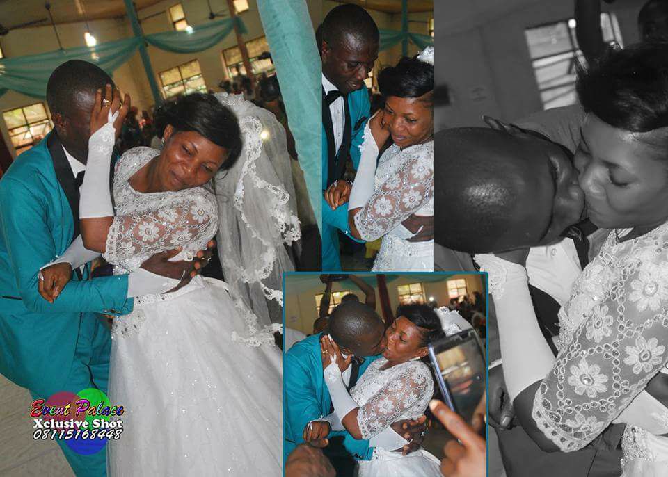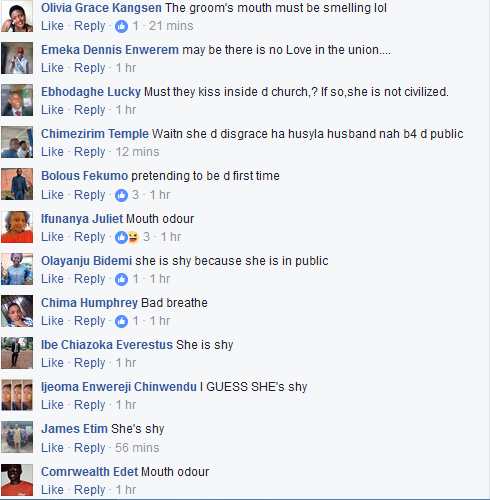 A woman who was shy to kiss her man at the altar during their wedding ceremony – jokingly pushed her husband away when he brought his mouth to seal the union. Even when she eventually kissed her hubby, she did so passively as her family, friends and other church members erupted in laughter.