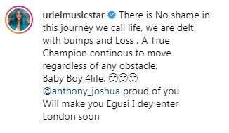 Baby Boy 4life. @anthony_joshua proud of you. Will make you Egusi I dey enter London soon”