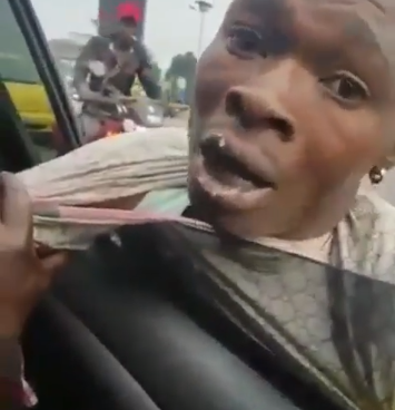 The thief pictured above, attempted to snatch a phone from a car in traffic but the passengers were fast enough to grab his hands. This happened in Congo.