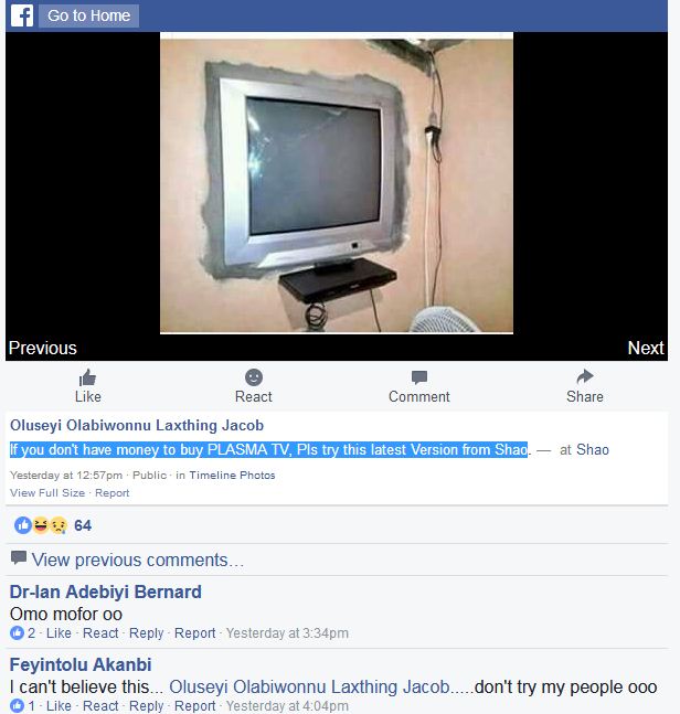 he wrote “If you don’t have money to buy PLASMA TV, Pls try this latest Version from Shao”