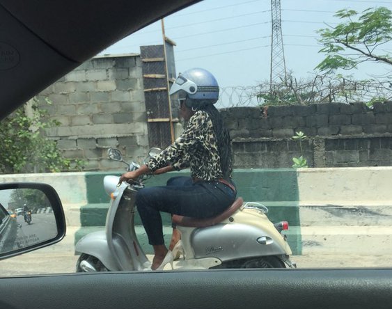 Cute lady in heels seen riding a motorcycle on 3rd Mainland Bridge. #InternationalWomen’sday. Photo credit: Fakoya Tolulope
