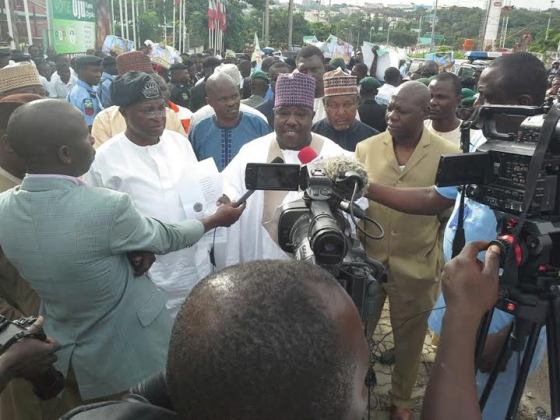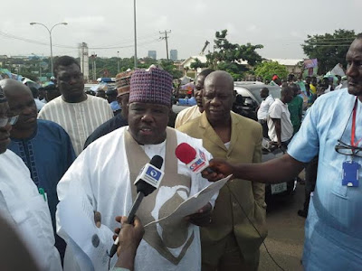 The immediate past National Chairman of the Peoples Democratic Party (PDP) Senator Ali Modu Sheriff this morning reported to the National Headquarters of the party at Wadata Plaza, Abuja to “commence his official business”. He was prevented from gaining entrance by security operatives, claiming a directive from the IG said that nobody should be allowed to enter the compound.
