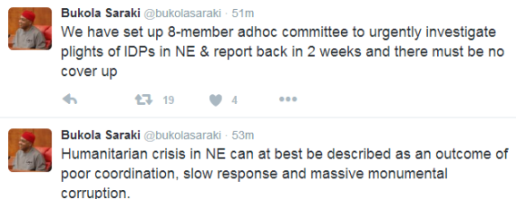 Senate President Bukola Saraki today announced an 8-members Ad-hoc Committee that would investigate the plight of the IDPs in Nigeria. According to Saraki, the Ad-hoc committee member are Senators Shehu Sani, Oluremi Tinubu, Ben Murray-Bruce, Ali Wakili, Theodore Orji, Yahaya, Tayo Alasaoudura Solomon Olamilekun and Yahaya Abdullahi.