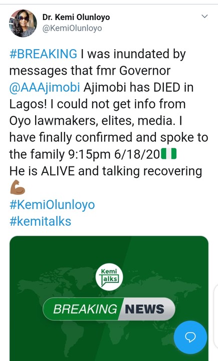 BREAKING I was inundated by messages that fmr Governor @AAAjimobi Ajimobi has DIED in Lagos! I could not get info from Oyo lawmakers, elites, media. I have finally confirmed and spoke to the family 9:15pm 6/18/20