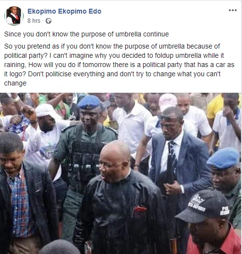 According to reports by Akwa Ibomites who claimed to have attended the rally, the senator and former state governor Akpabio, refused to use an umbrella in the rain as he firmly flaunted his broom at the event.