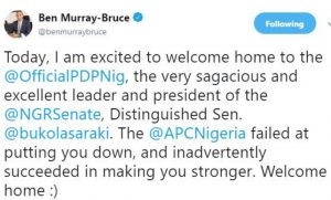 ‘Today, I am excited to welcome home to the @OfficialPDPNig, the very sagacious and excellent leader and president of the @NGRSenate, Distinguished Sen. @bukolasaraki. The @APCNigeria failed at putting you down, and inadvertently succeeded in making you stronger. Welcome home’ Ben Bruce Tweeted.