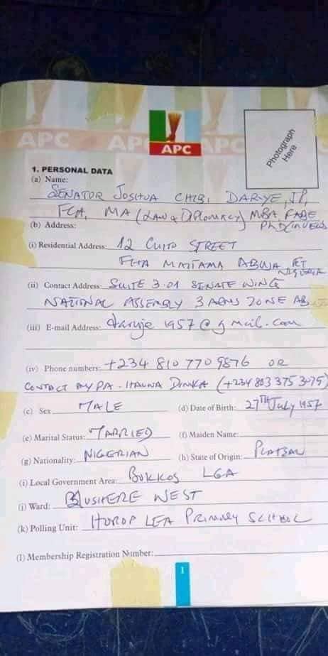 Former Governor of Plateau state and senator Joshua Dariye has purchased nomination form from prison for his reelection.