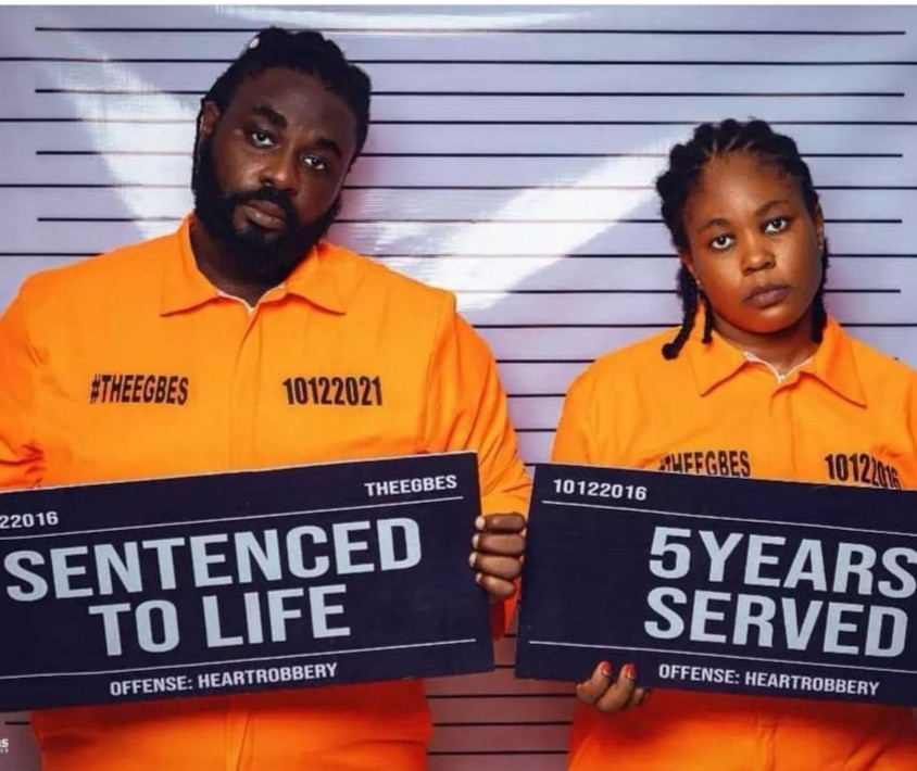 In photos shared online, they are seen holding mugshot letter boards, with the words, “5 years served” and “sentenced to life” written on them.