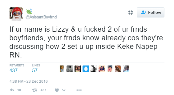 This story narrated by guy who claims he overheard the conversation in public, shared the warning to the girl via Twitter. So, ‘Lizzy’, better get ready. See more of his tweets after the cut…