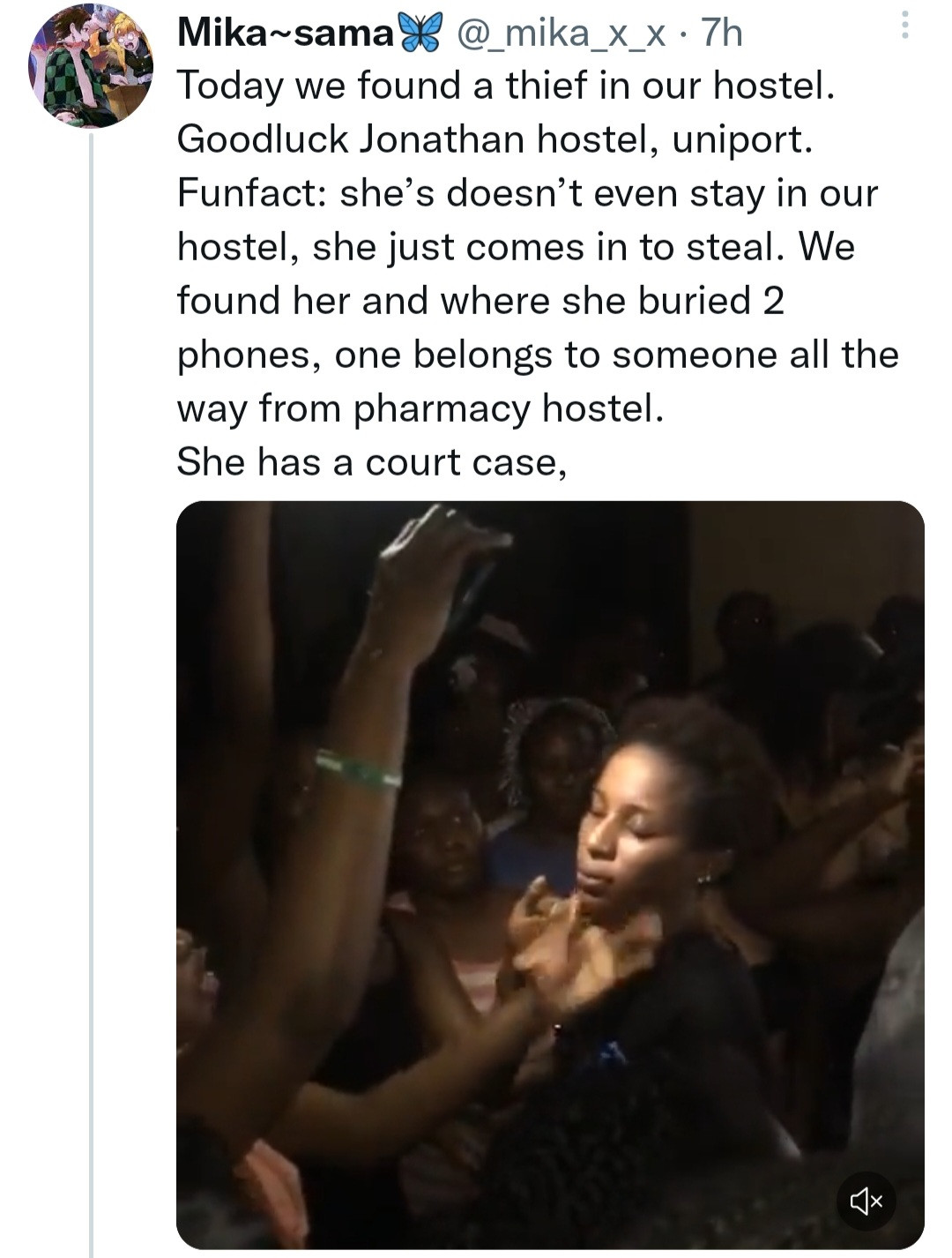 She was allegedly caught stealing mobile phones in a hostel in University of Port Harcourt, Rivers State.