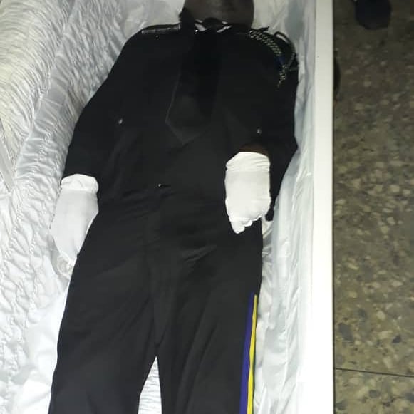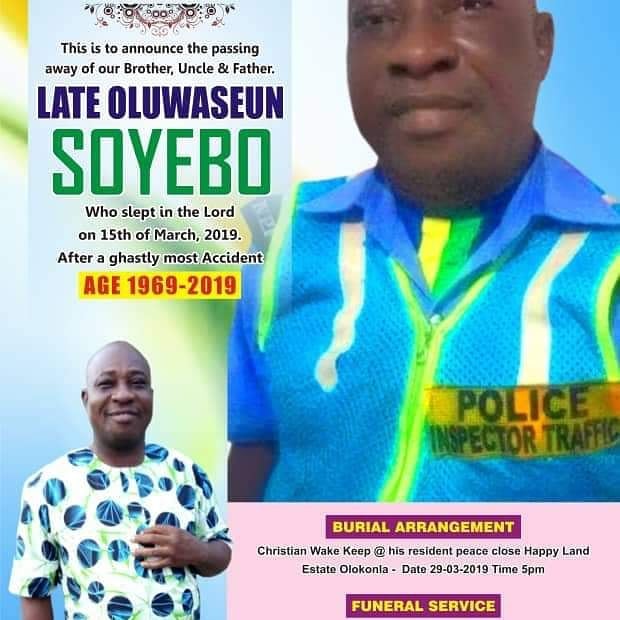 The late traffic control police officer identified as inspector Seun Shoyebo was killed a forthnight ago when he ran into an abandoned truck in Ajah area of Lagos. The officer ran into the truck and got crushed to death in the process