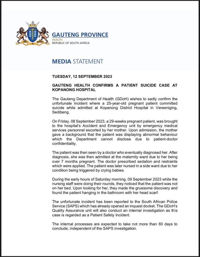 The Gauteng Department of Health in South Africa has confirmed that a seven months pregnant woman committed suicide in a hospital bathroom