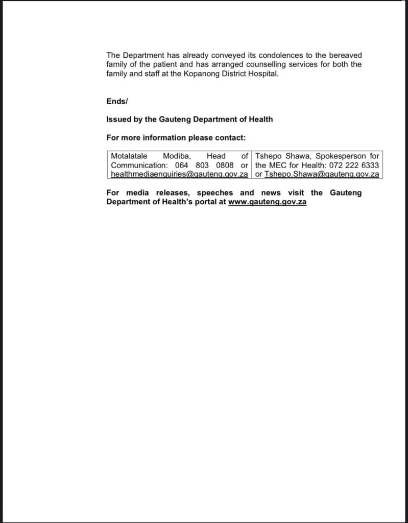 “The Gauteng Department of Health’s Quality Assurance unit will also conduct an internal investigation, as this case is regarded as a Patient Safety Incident,” he said.