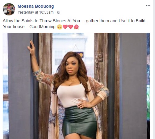 Moesha Boduong has received lots of backlash since the video surfaced with many fans calling her unprintable names. However, the actress has shown that she’s undeterred by their comments by sending them a response via Facebook. In her response, she called critics of the interview hypocrites whose stones thrown at her will be used to build a house.