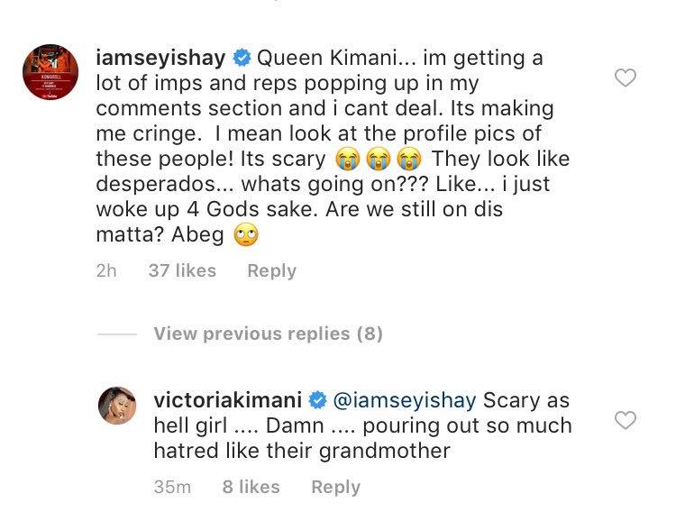 However following the backlash they faced, Seyi Shay who joined Victoria Kimani to shade Tiwa Savage and her fans, claimed that the troll comments she is getting is making her cringe. Victoria Kimani on the other hand, said the comments she’s been getting is scary and it is from those ‘pouring out so much hatred’ just like their grandmother (recall she described Tiwa Savage as a grandmother in her cover). Here is screenshot of the exchange below;