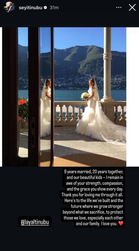 ‘’9 years married, 20 years together, and our beautiful kids — I remain in awe of your strength, compassion, and the grace you show every day. @layaltinubu Thank you for loving me through it all. Here’s to the life we’ve built and the future where we grow stronger beyond what we sacrifice, to protect those we love, especially each other and our family. I love you.”