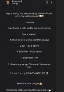 Michy, the baby mama of Ghanaian singer, Shatta Wale is searching for a sperm donor, so she could have a second child.