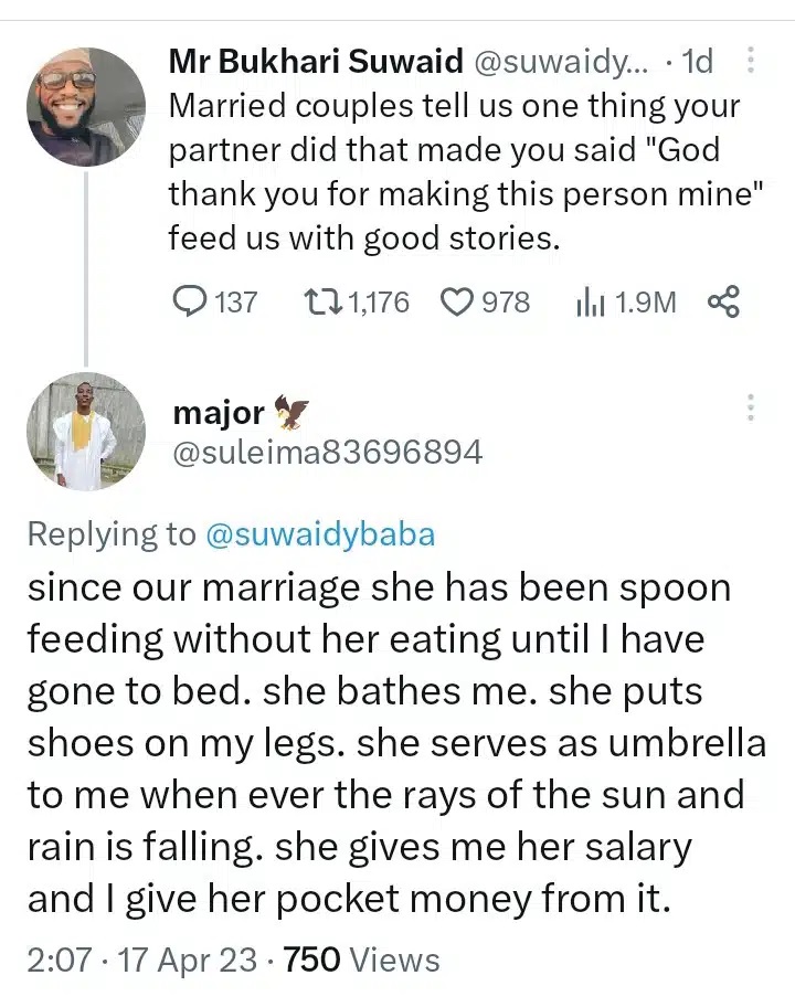 According to a Twitter user, Suleiman, his wife spoon feeds and gives him her salary from where he gives her pocket money.